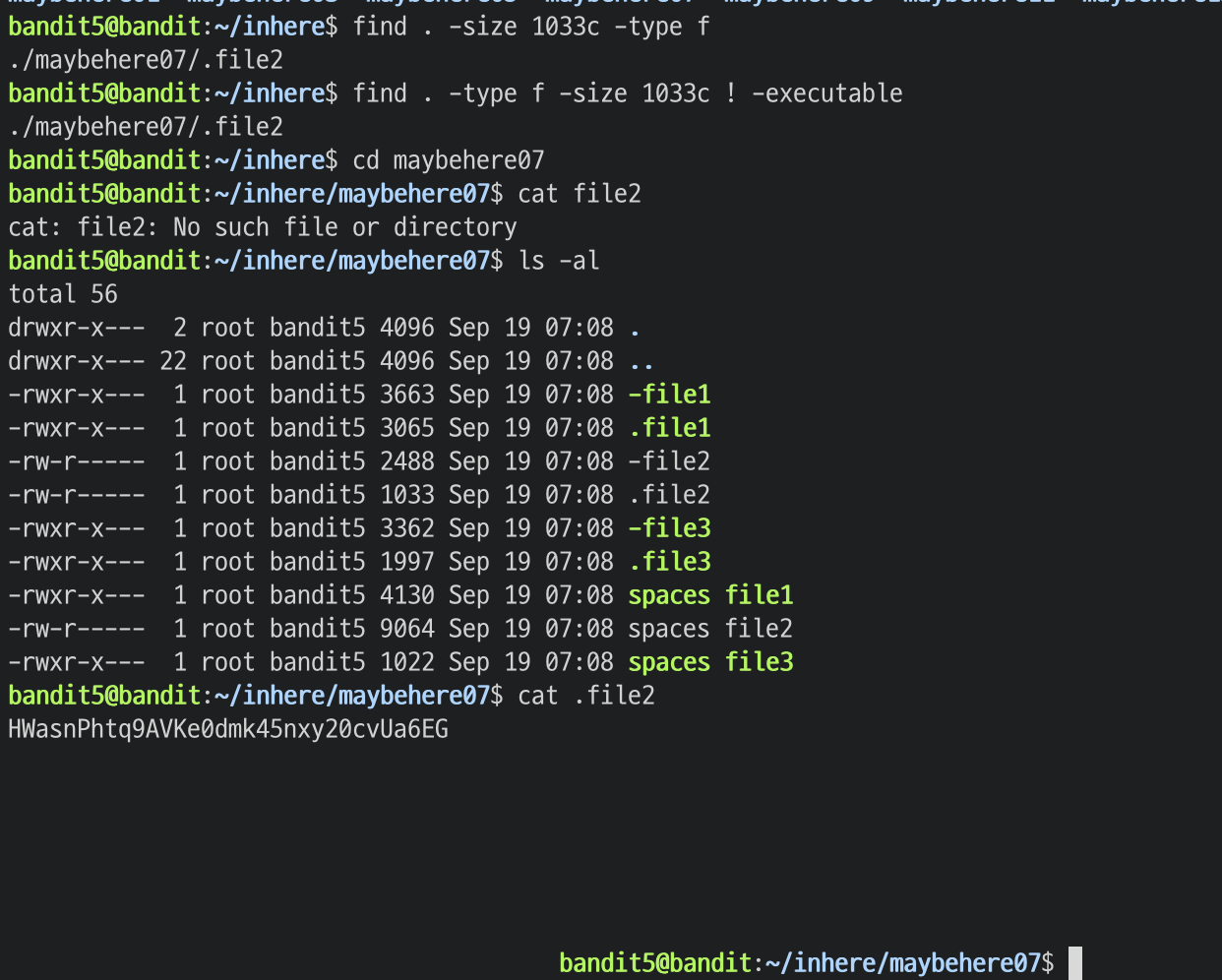 다음 레벨로 가는 비밀번호는 inhere디렉터리 내부에 있는데, 이게 어딘가에 있다. 이것의 특징은