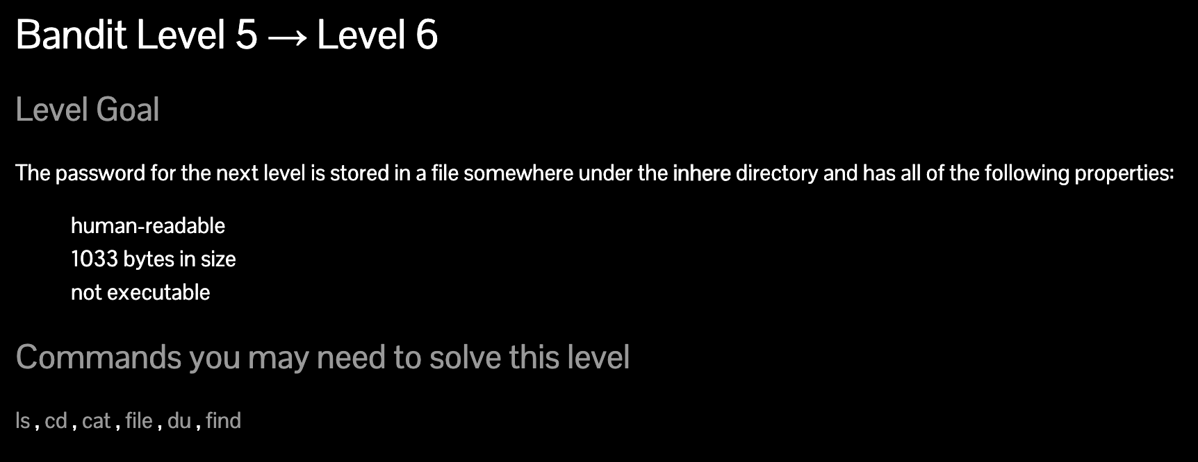 We're hackers, and we are good-looking. We are the 1%. <!-- Please read and accept the Rules! --> Level Goal The password for the next level is stored in a file somewhere under the inhere directory and has all of the following properties: human-readable 10
