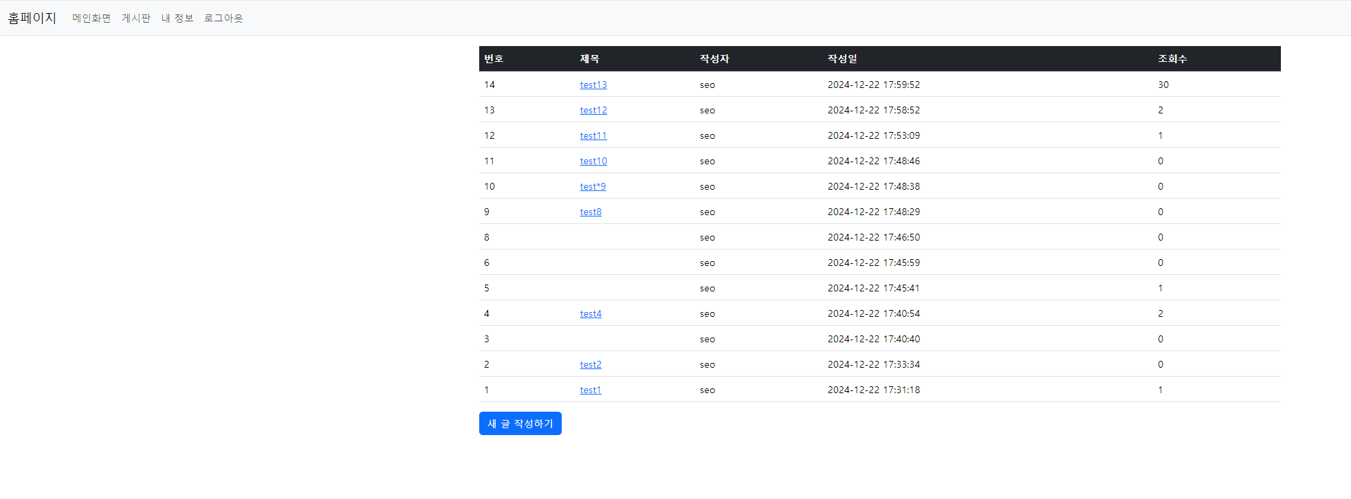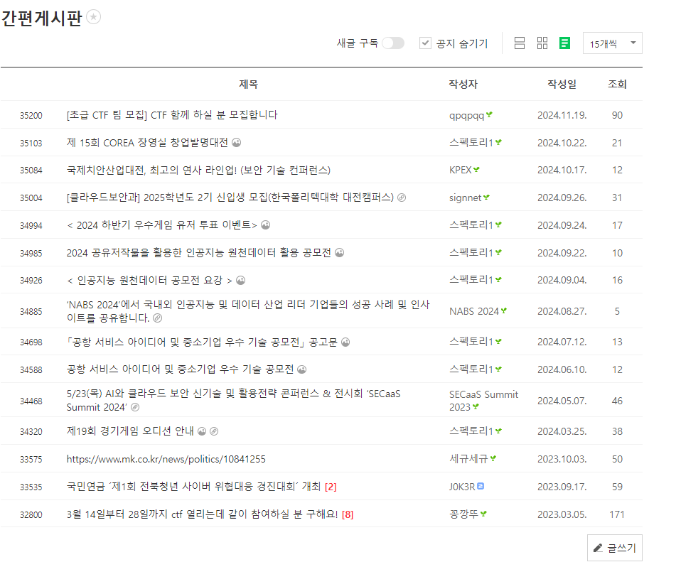 일단 필수적으로 있는 것은 제목, 작성자, 작성일, 조회수 이렇게 4개는 기본적으로 깔려있다.