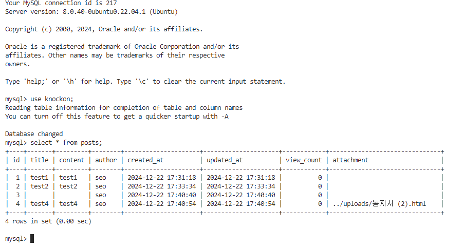 마지막 test4를 보면 데이터베이스에 파일이 등록된 것을 확인할 수 있고,