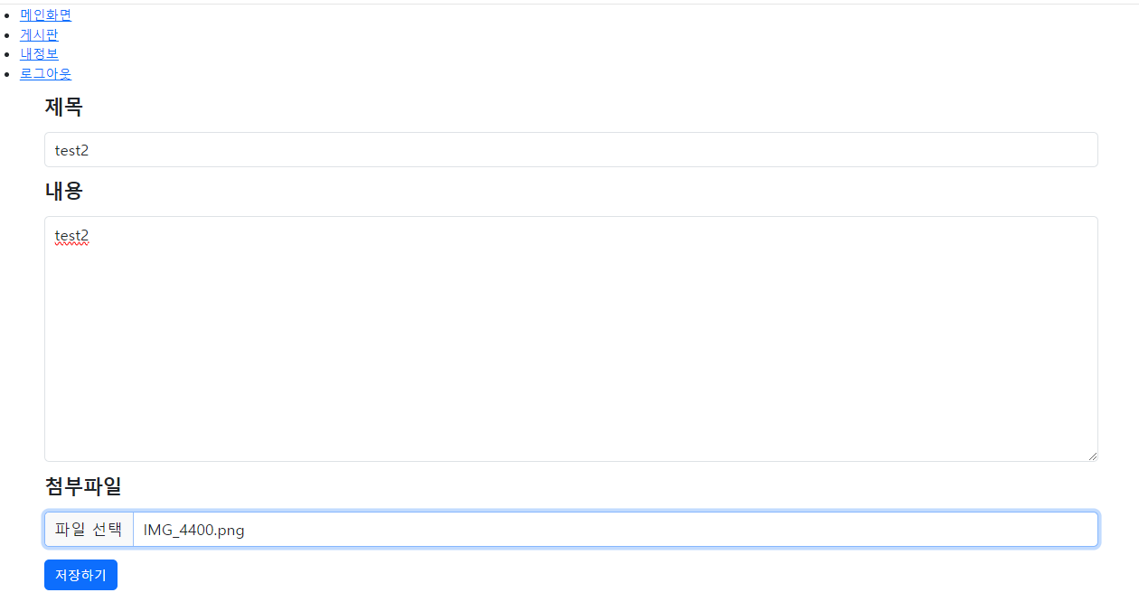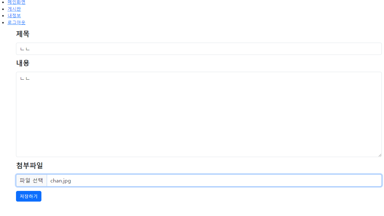 제목, 내용, 첨부파일을 설정하게 해놨다. 여기서 그냥 저장하기 버튼을 누르면