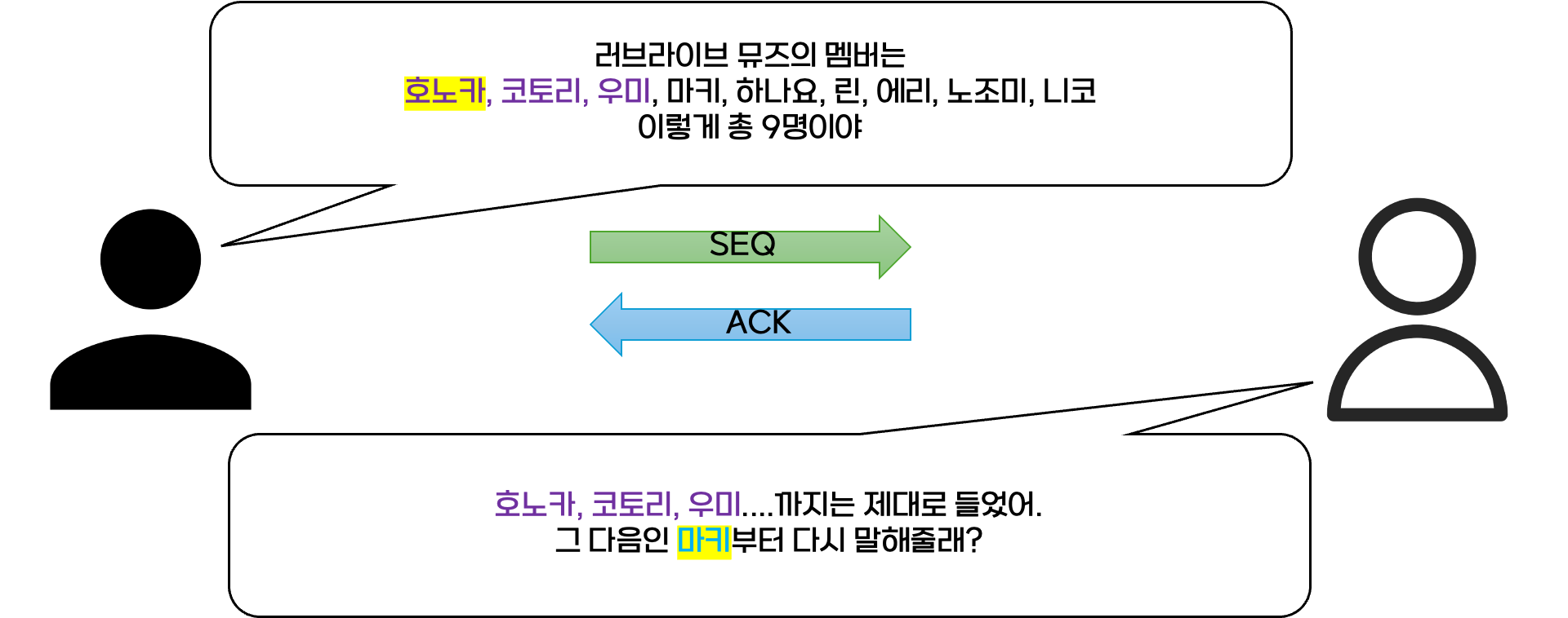 여기서 검정이가 처음 말하는 순서인 호노카가 바로 시퀀스 넘버, 즉 여기서부터 데이터 보낼게~에 해당하기 때문에 호노카가 시퀀스 넘버(seq)에 해당하고, 흰색이가 다음 마키부터 보내달라고 한 부분이 애크 넘버(ack)가 되겠다.