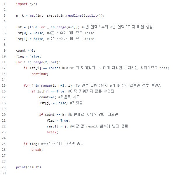이도 마찬가지인데, 범위는 n, k를 입력받았을 때 n까지로 정해져있고, k번째로 지워진 수를 구하는 것이고 n의 수가 1000 보다 작으므로 이중포문으로 돌려도 충분한 자원으로 프로그램을 실행시킬 수 있을 것이다.